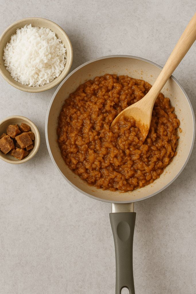 - Cook Coconut and Jaggery: Add the grated coconut and jaggery to the pan. Stir continuously as the jaggery melts and blends with the coconut. This should take about 5-7 minutes. The mixture will thicken and become slightly sticky but not overly wet.