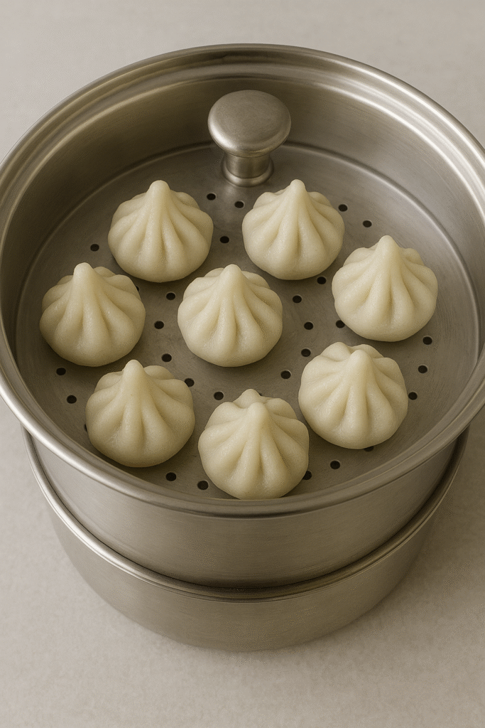 - Steam to Perfection: Place the modaks in the steamer and cook for 10-12 minutes on medium heat. You’ll know they’re done when the rice flour covering turns shiny and slightly translucent.